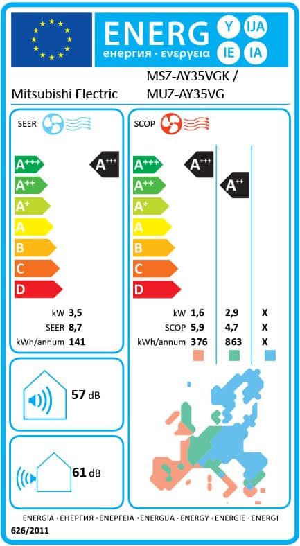 - Преобразуване на ел. енергия: охл./отопл. SEER 8.7 / SCOP 4.7 w/w